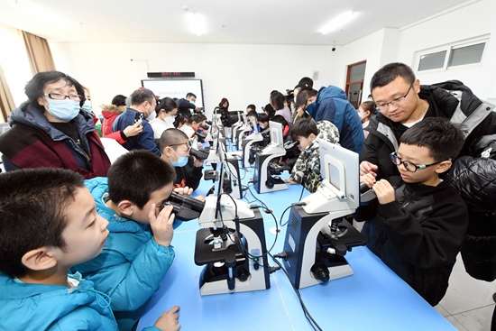 1月19日,哈爾濱醫科年夜黌舍園開放,游客在醫學形狀學試驗室經由過程顯微鏡察看人體的奧妙。
