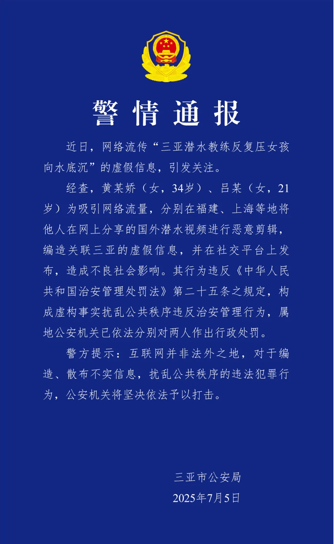 經查,黃某嬌(女,34包養歲)、呂某(包養網女,21歲)為吸引收集流量甜心寶貝包養網,分辨在福建、包養網上海等地將別人在網上分送包養網朋友的國外潛水錄像停止歹意剪輯,假造聯包養網包養繫關係三亞的虛偽信包養網息,并在社交包養金額平臺上發布,形成不良社會影響。其行動違背包養《中華國民包養留言板共包養網和國治安治理處分法包養》第二十五條之規則,組成虛包養網擬現實搗亂公共次序包養網ppt違背治安治理行包養管道動,屬地公安機關已依法分辨對兩人作出行政處分。