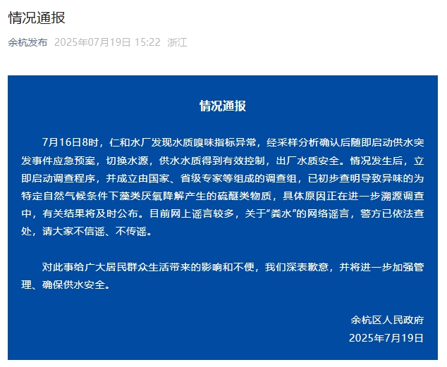 ·杭州市余杭區傳遞自來水氣息異常。