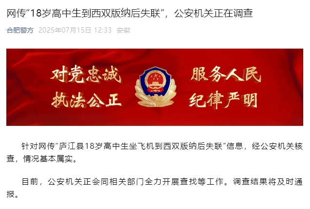 ·合肥警方傳遞“18歲高中生到西雙版納后掉聯”:情形基礎失實,正全力查找。