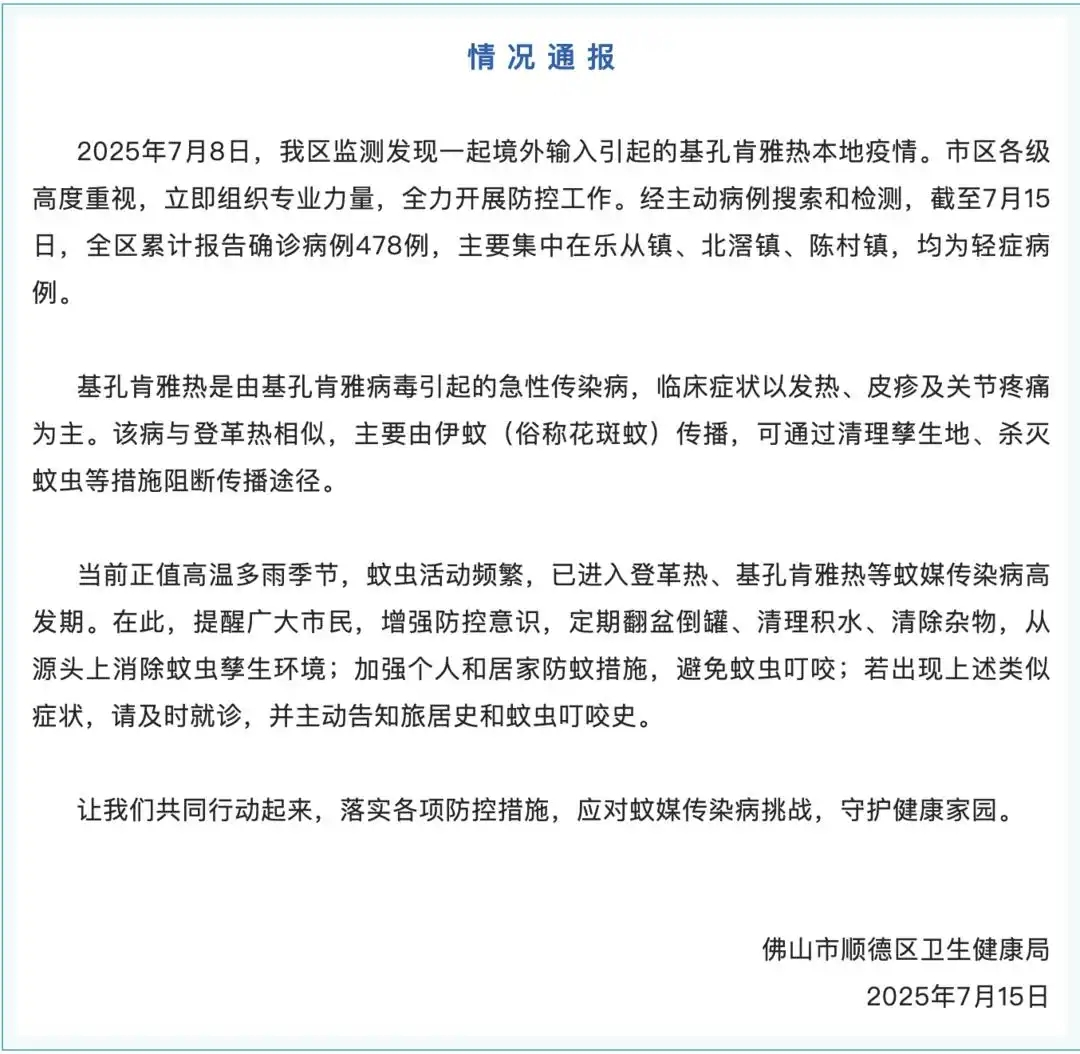 ·廣東佛山順德區發包養網明一路境外輸出惹起的基孔肯雅熱當地疫情。截至7月15日,全區累計陳述確診病例478例。