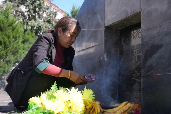 “阿媽來看你了,帶了你最愛吃的餅子和糖。”饒平義士墓碑前,65歲的嘎瑪措姆佝僂著腰,從竹簍里取出祭品擺放好,輕聲召喚著逝往的“兵兒子”。