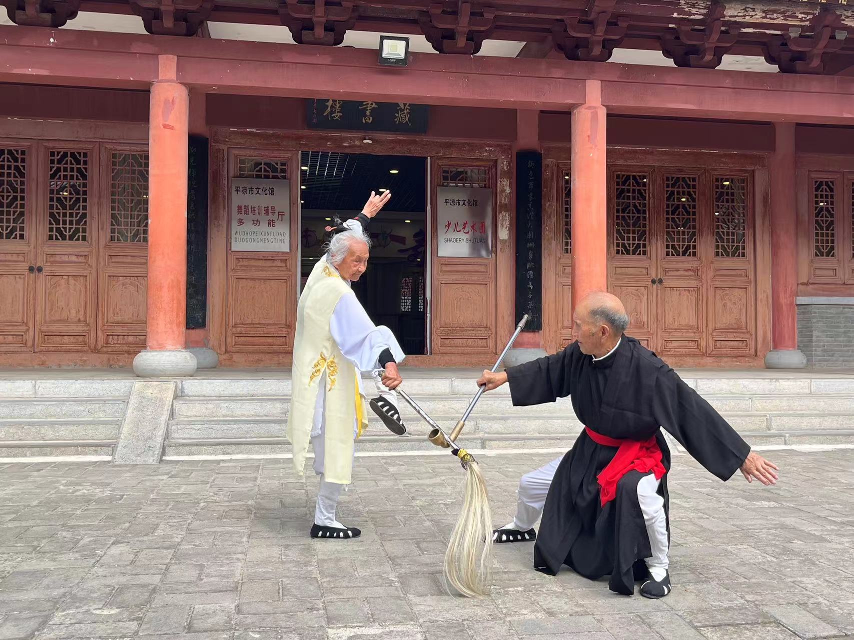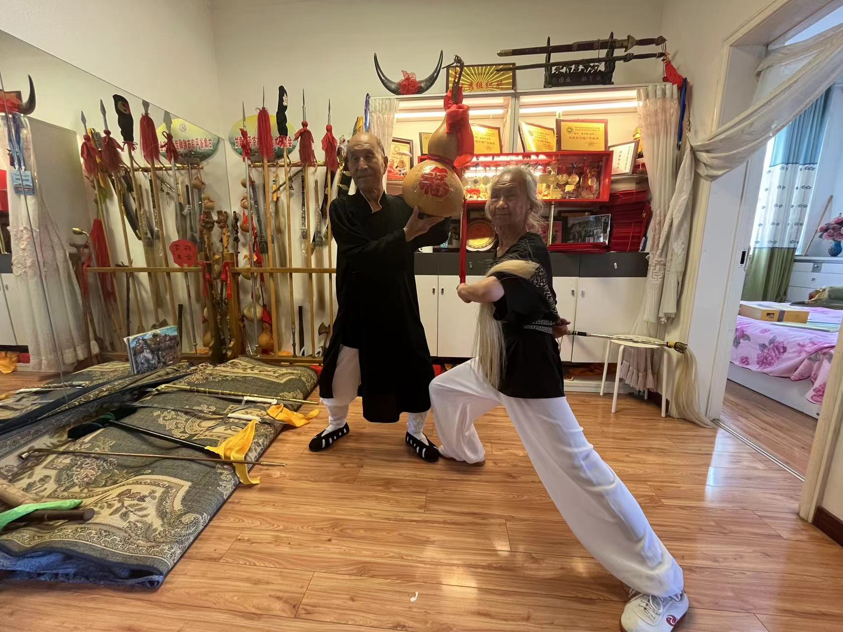 兩位白叟用葫蘆和佛塵作為奇兵展現崆峒技擊,后面則放置了獎牌展現柜和武器架。