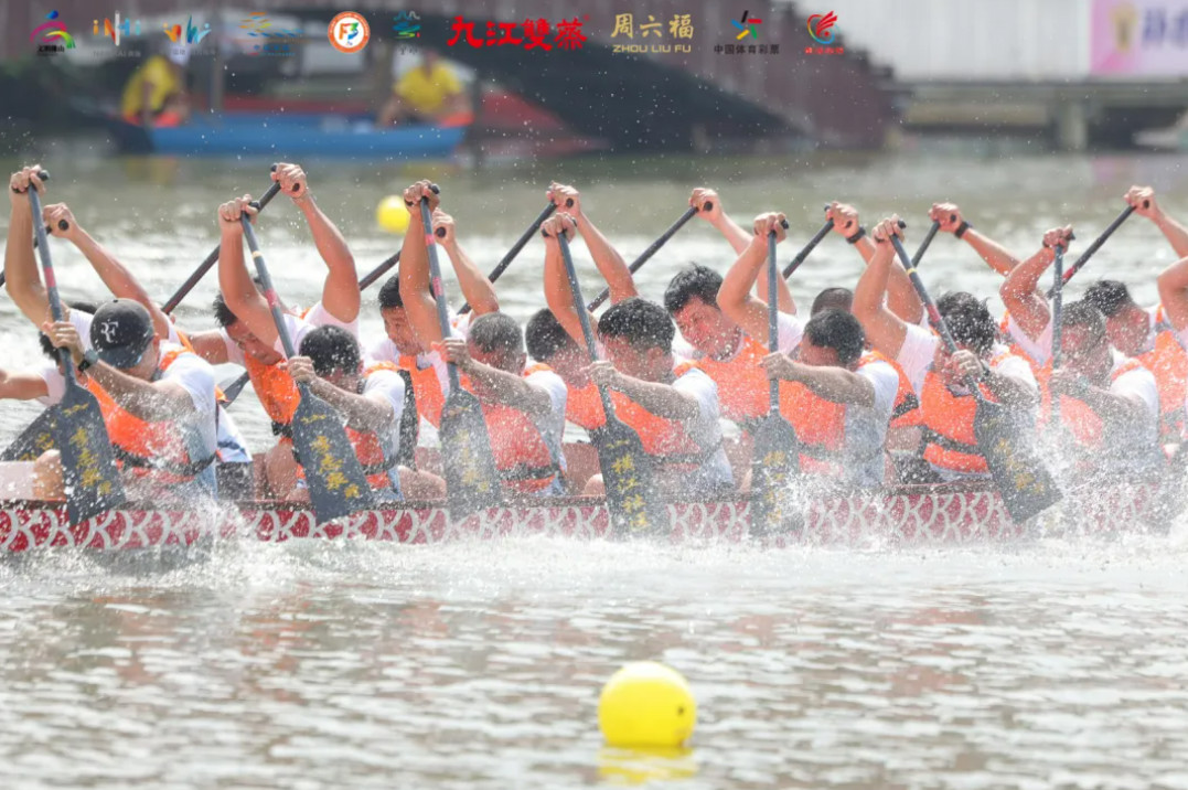 “咚、咚、咚……”現場彩旗飄揚,鑼鼓雷叫。跟著一聲令下,一艘艘龍船如蛟龍出海,剎時水花飛濺、船如箭發,19支步隊睜開了一場“速率與豪情”的較勁,龍船竊匪們紛紜手起槳落。